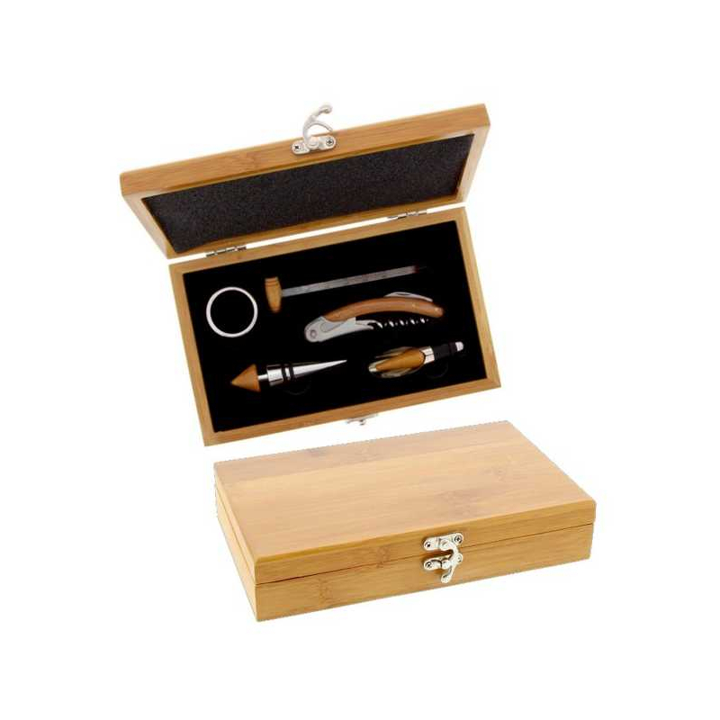 Il comprend un "sommelier" (décapsuleur, tirebouchon, petite lame de couteau ...) en bois courbé, un thermomètre à vin, un stop goutte, un bouchon design et un bouchon verseur.